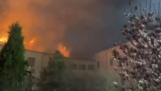 Echipajele operative acționează pentru localizarea și lichidarea incendiului, depunând eforturi pentru limitarea propagării flăcărilor la restul construcțiilor.