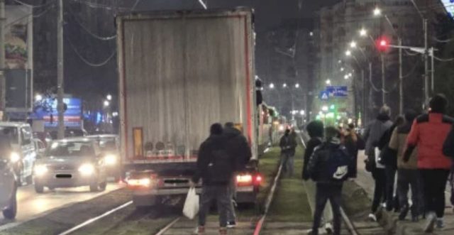Traficul bucureștean, o „junglă”. TIR blocat pe linia de tramvai